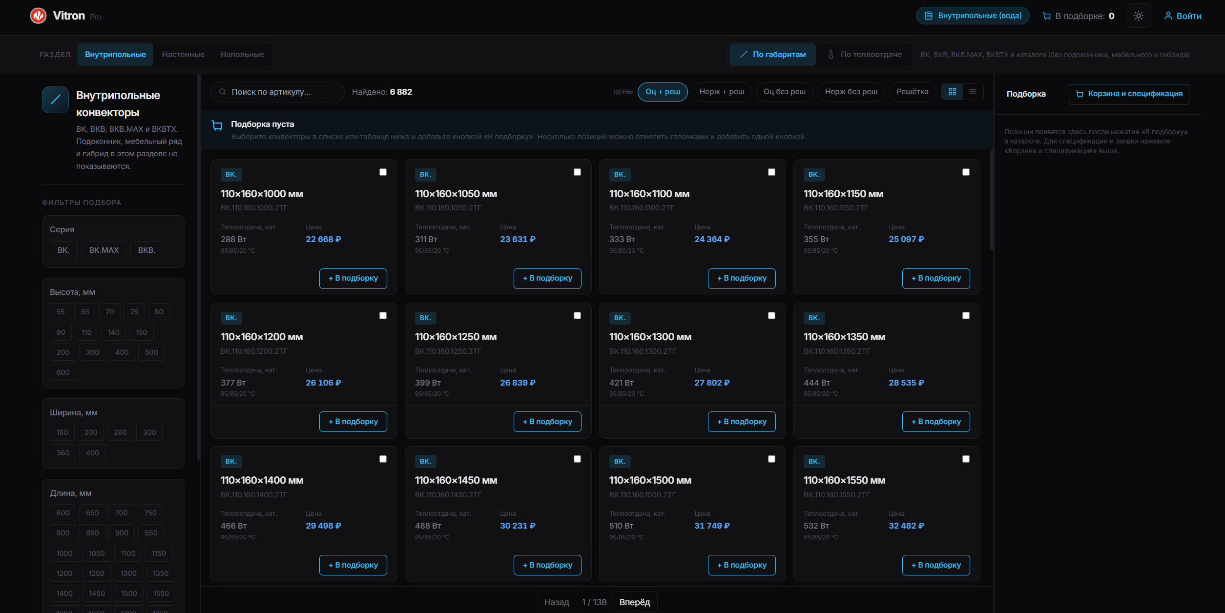 Vitron Pro работает иначе. Он не заставляет пользователя сначала разбираться во всём ассортименте. Он помогает сразу перейти к практическому результату — подобрать подходящие конвекторы по заданным параметрам.